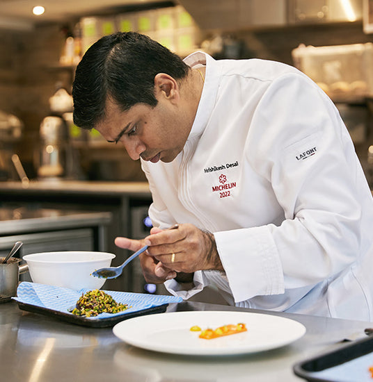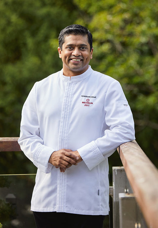 Hrishikesh was not destined to become a chef. He began by studying hotel management in India, preparing to work in service. He then obtained a scholarship to join the Institut Paul Bocuse in Lyon, France. However, everything changed when he first saw that you could caramelize the sugar in a crème brûlée with a blowtorch. This moment was the turning point for Hrishikesh, which led him to take a culinary arts course at the Paul Bocuse Institute. Through this training, he gained experience in a Michelin-starred restaurant, paving the way for his now renowned career as a chef.