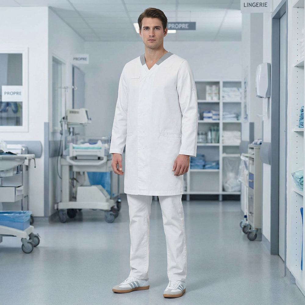 A long blouse with roll-up sleeves for men, punctuated with functional details in a range of reassuring or fashionable colors. The WIND blouse has a mid-back length of approx. 100 cm and its reinforced functional pockets offer enough space for your various utensils. The snap buttons are hidden, stopping points reinforce and facilitate the center front opening. The solid polyester & cotton material in mechanical stretch gives the product comfort and resistance to industrial washing as is required in many medical sectors. Both practical and essential, this long white, gray or burgundy coat for the more daring, will be your most faithful uniform in the hospital, pharmacy or medical office.