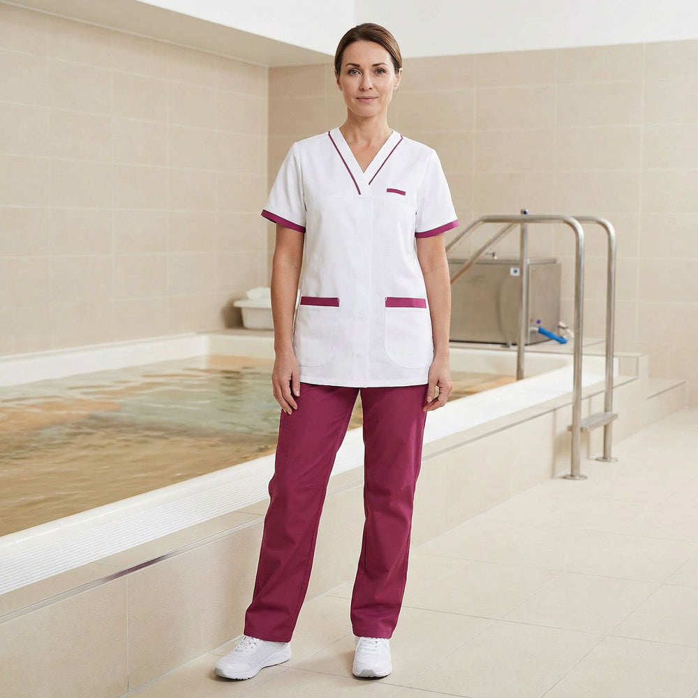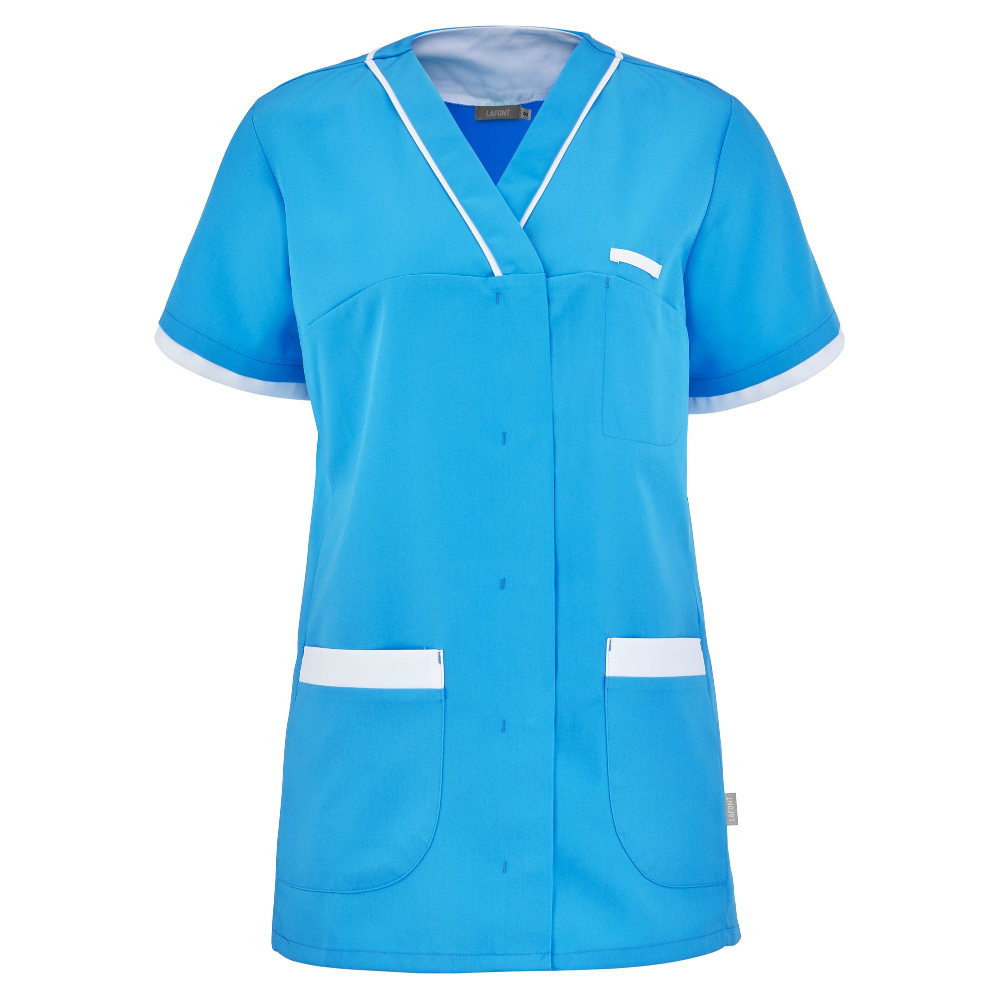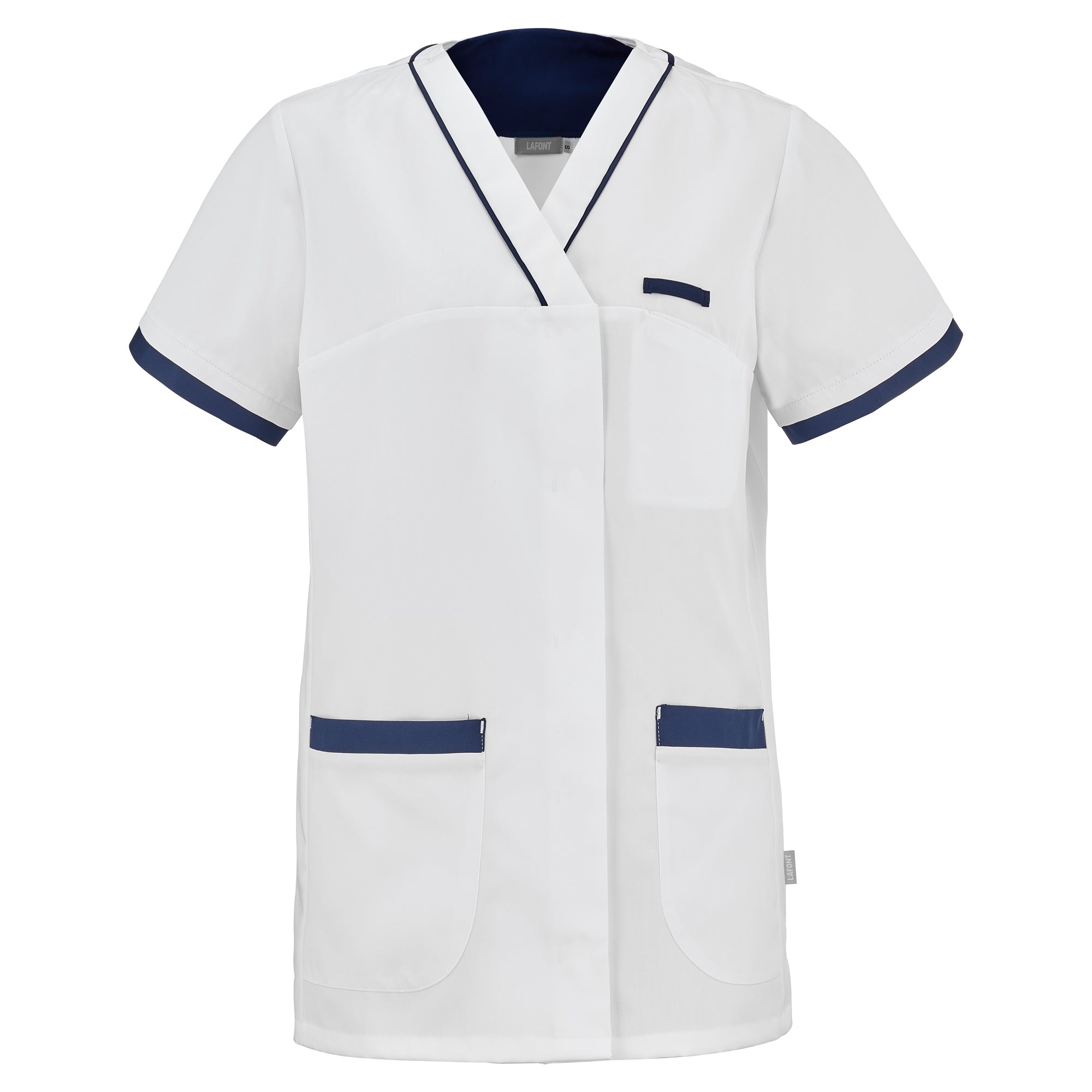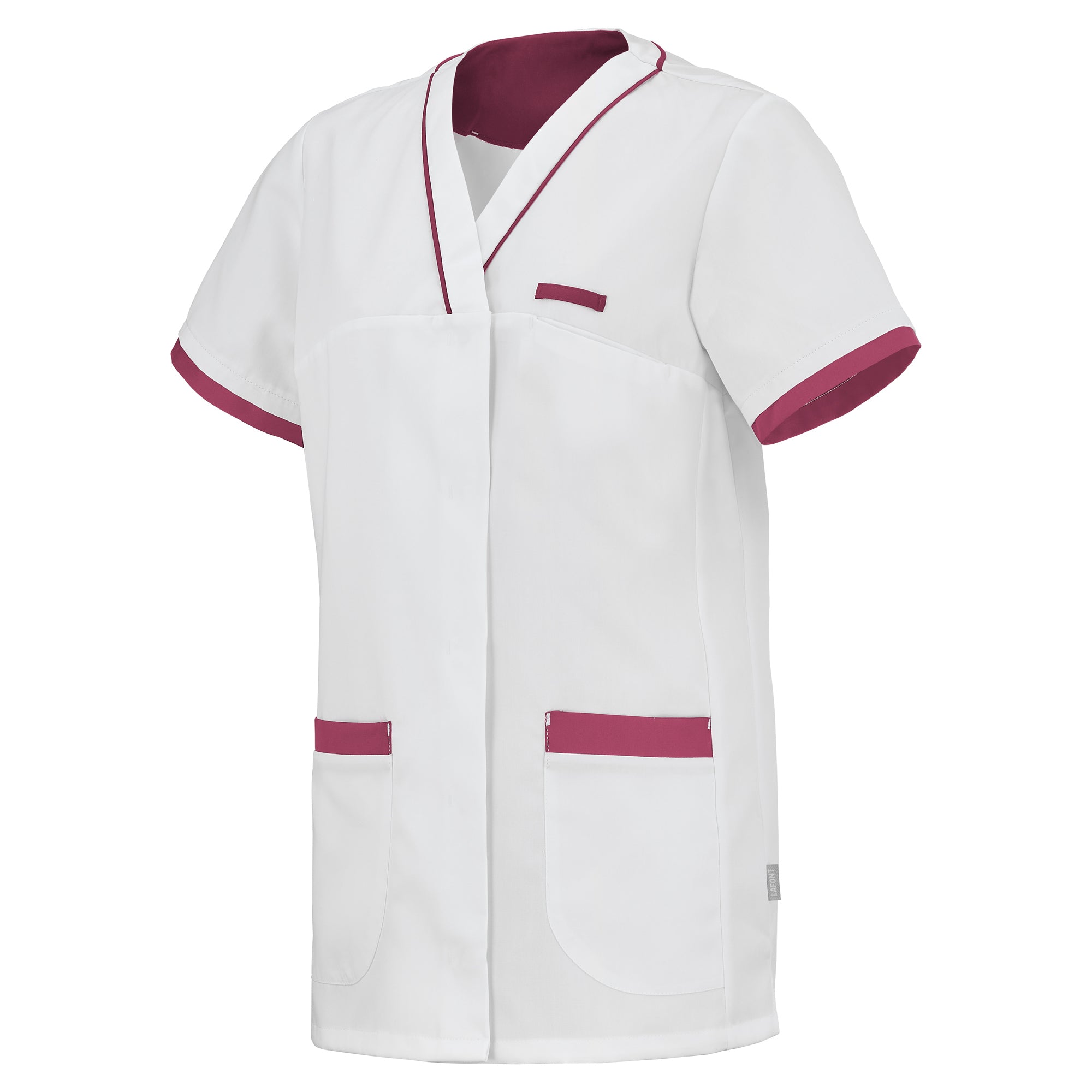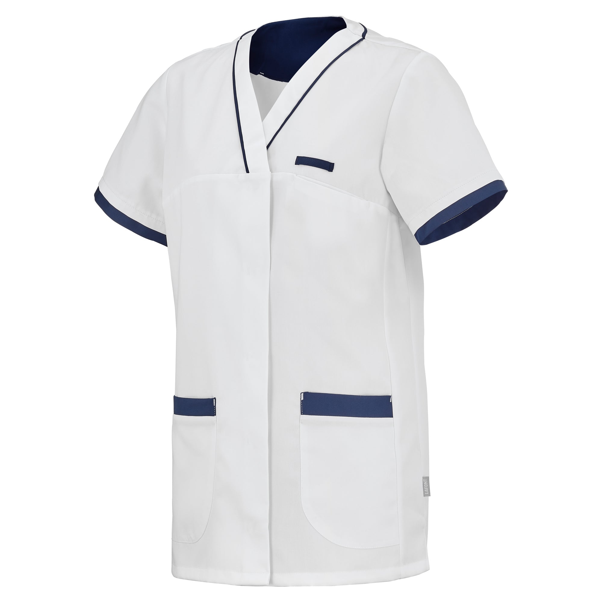 Work tunic intended for women in the medical and health sector. Made from 50% polyester 50% tencel® lyocell fabric, the Alexandra women's medical tunic is comfortable and breathable. The very soft tencel® fiber comes from sustainable and environmentally friendly forestry. This material, used for the Lafont range of blouses, has moisture absorption capacity and anti-odor properties. This short-sleeved professional tunic with a fitted cut has a V-neck and an asymmetrical central closure with hidden zippers. The Alexandra medical coat also includes a chest pocket, two lower pockets and a watch hook or beeper holder.