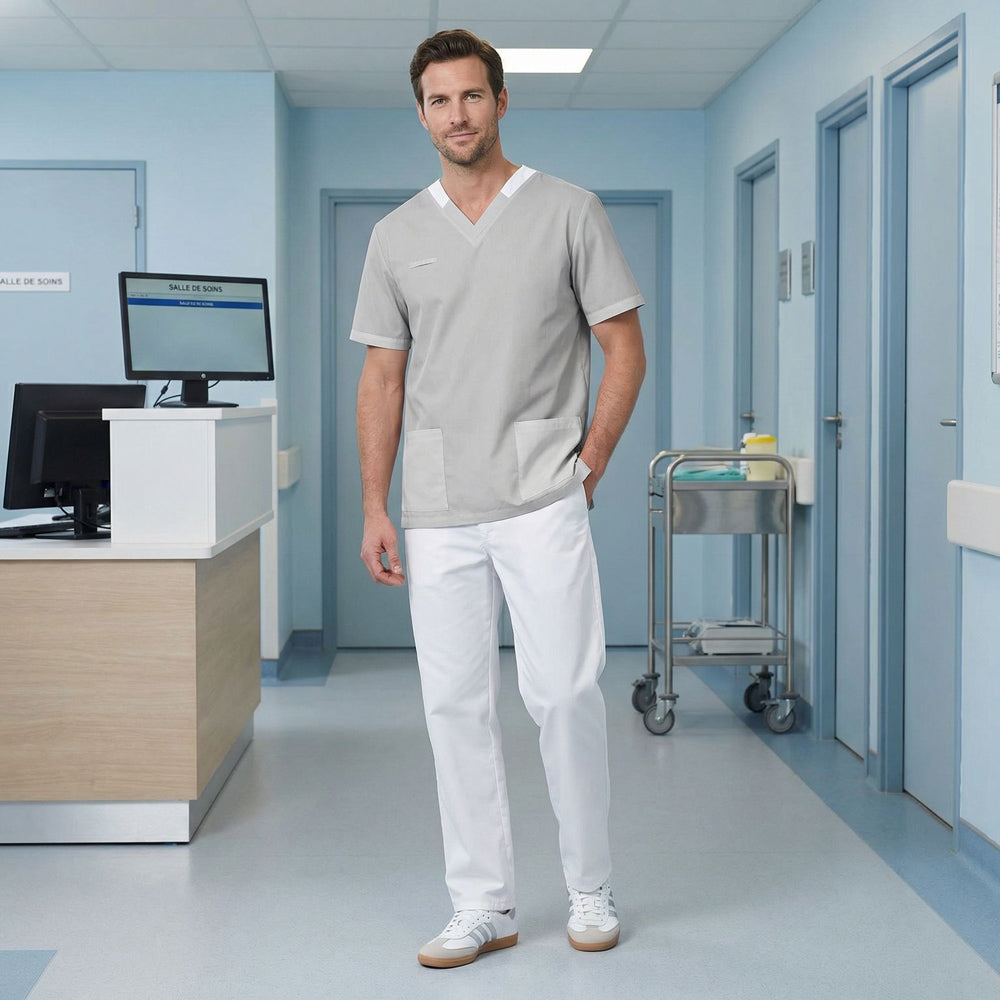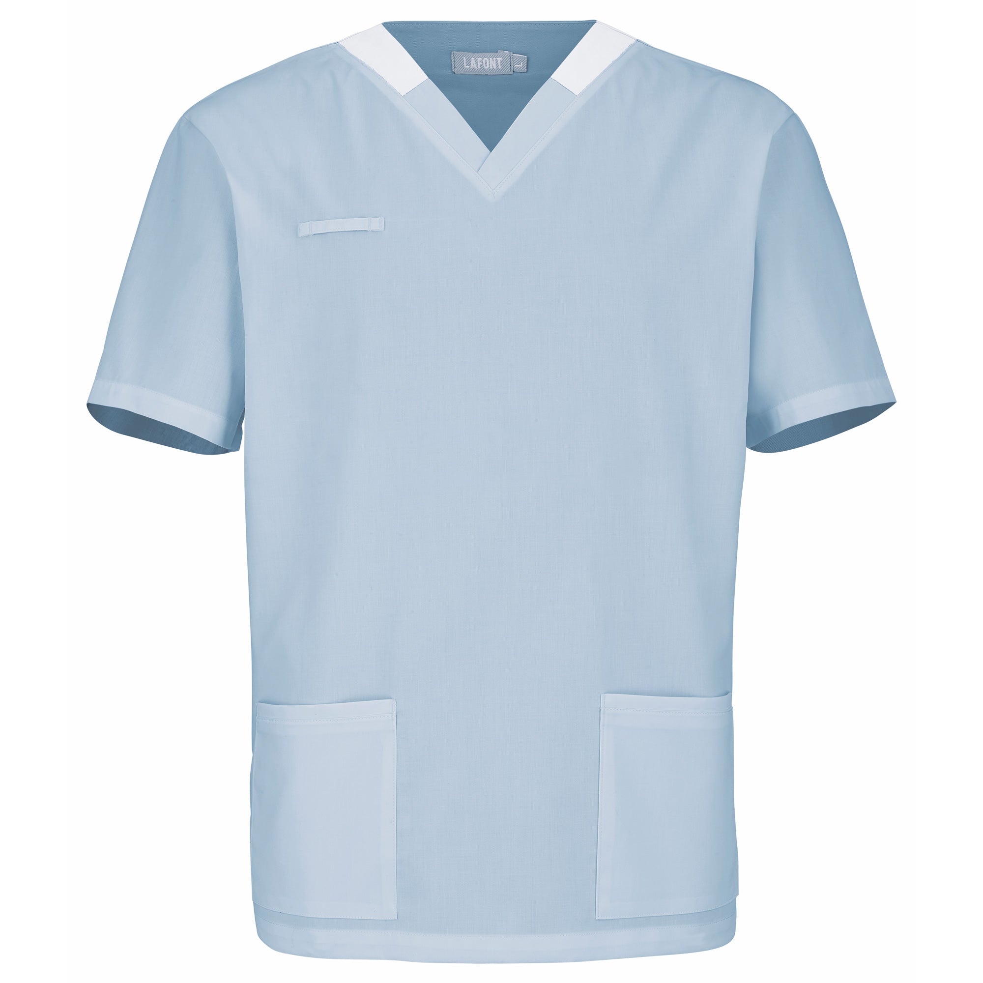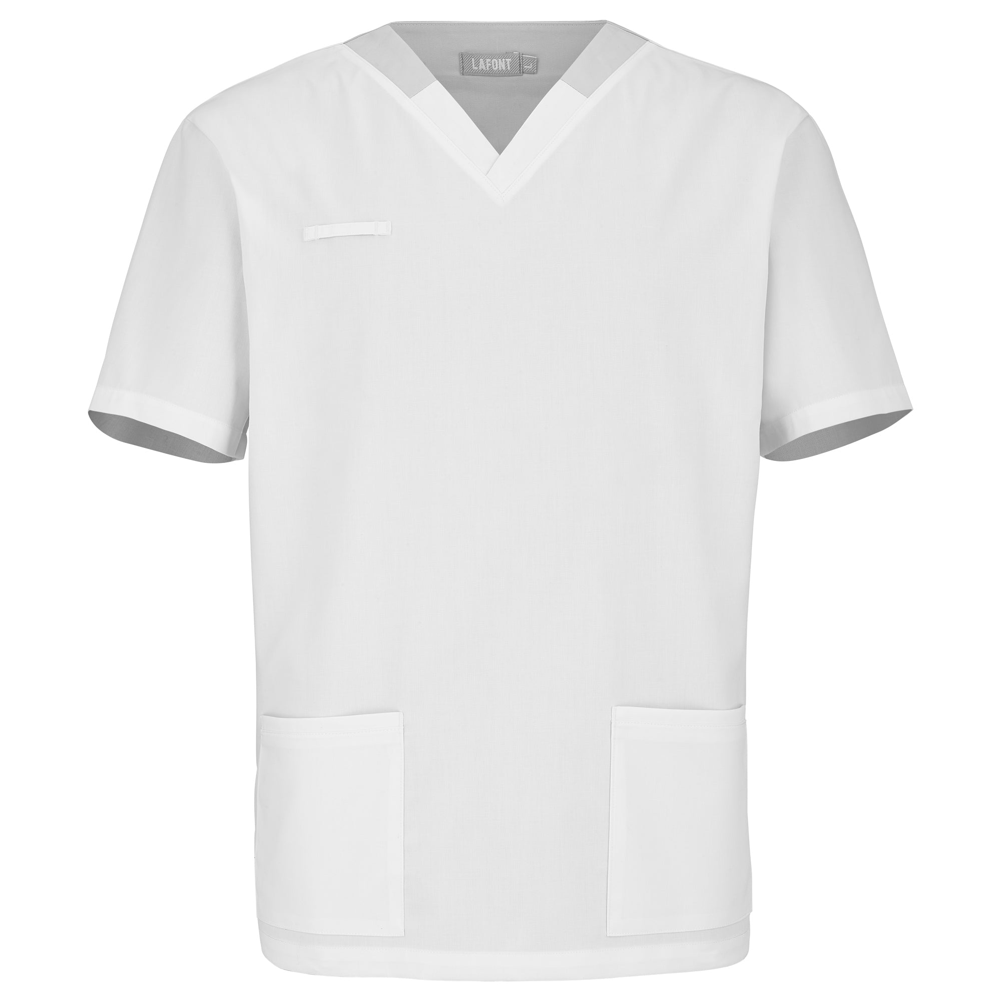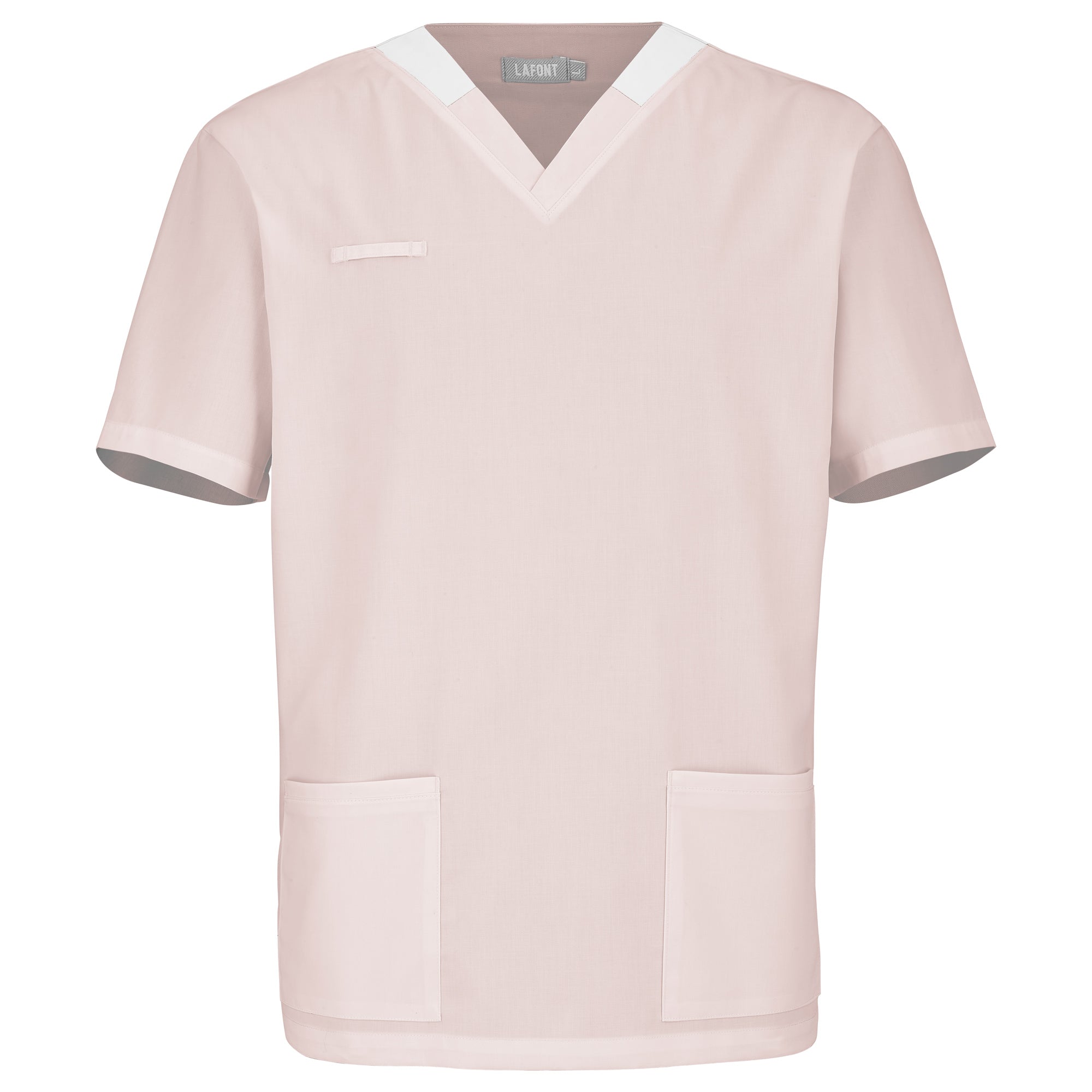 Here is a unisex short-sleeved tunic in stretch mechanical polyester cotton. It is a stretch produced by weaving which uses the elastic capacities of the fibers without requiring elastane. The cut is straight, the V-neckline enhanced with contrasting colors frees the neck. This tunic that goes over the head offers two large patch pockets, as well as a chest badge holder, an interior marking collar and side slits to facilitate ease of movement. This item meets industrial washing standards and is available in a wide range of colors, for all of your services.