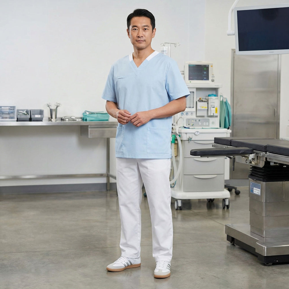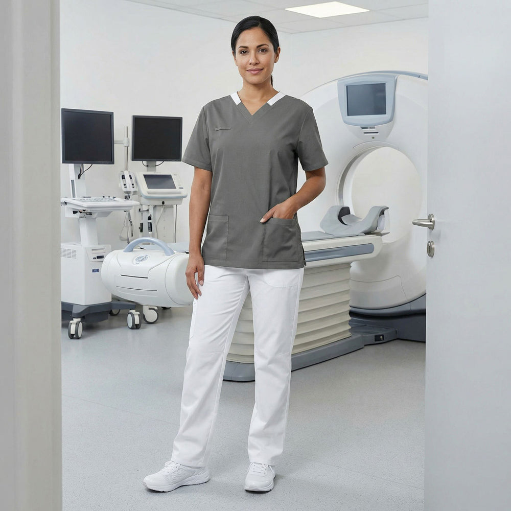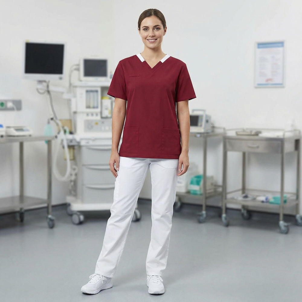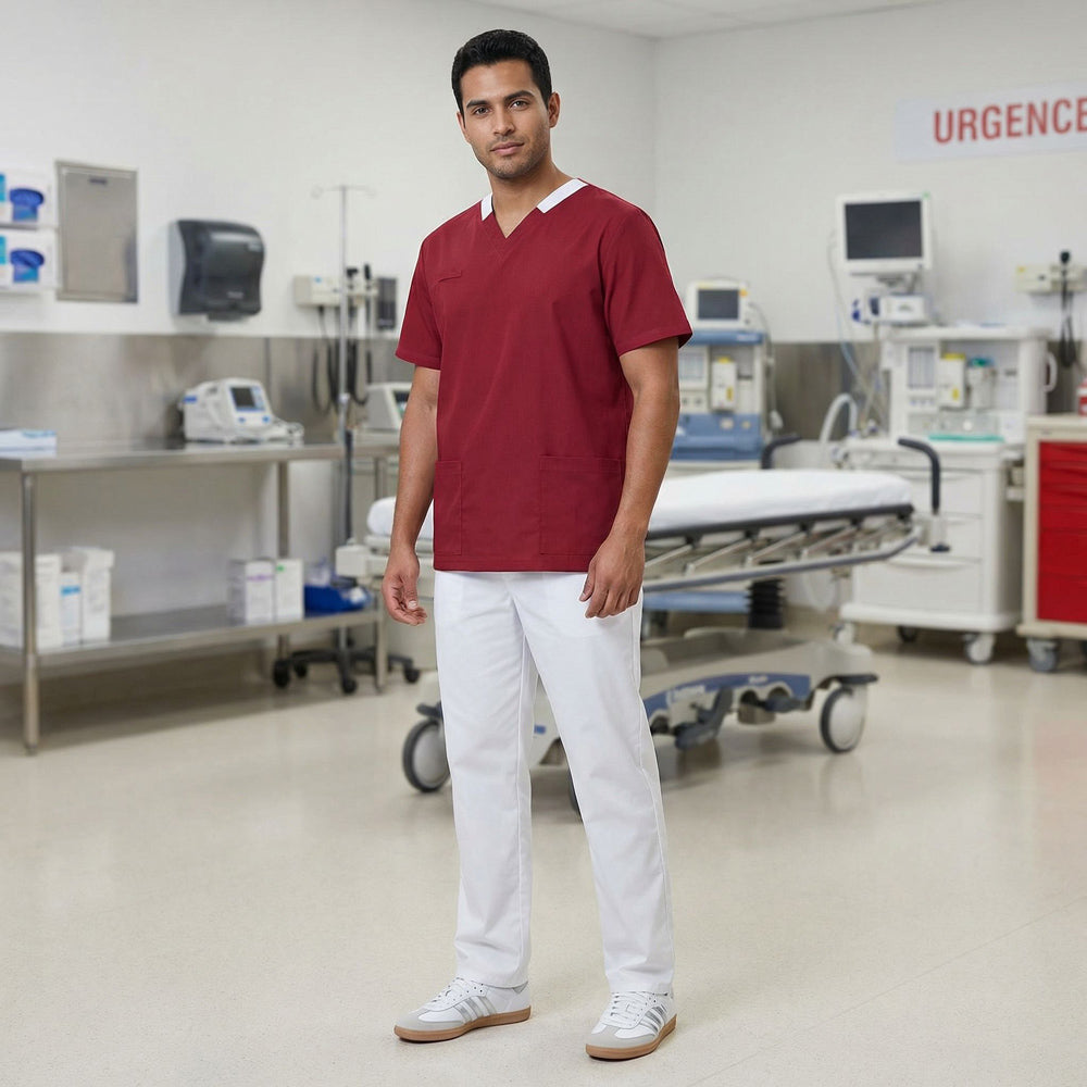 Here is a unisex short-sleeved tunic in stretch mechanical polyester cotton. It is a stretch produced by weaving which uses the elastic capacities of the fibers without requiring elastane. The cut is straight, the V-neckline enhanced with contrasting colors frees the neck. This tunic that goes over the head offers two large patch pockets, as well as a chest badge holder, an interior marking collar and side slits to facilitate ease of movement. This item meets industrial washing standards and is available in a wide range of colors, for all of your services.