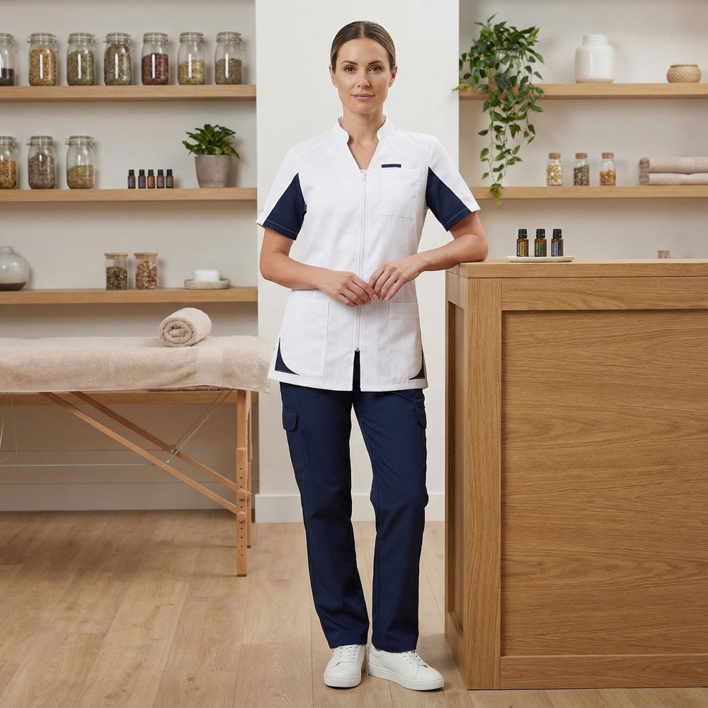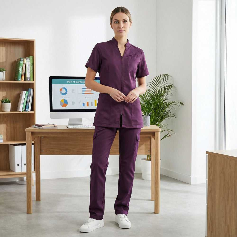 Blusa tencel® leggera e confortevole, ideale per le professioniste della cura e dei servizi alla persona. Realizzata in un tessuto 50% poliestere 50% tencel® lyocell, la casacca da lavoro donna Sandrine è morbida e traspirante. La fibra di tencel® proviene da una silvicoltura sostenibile e rispettosa dell’ambiente. Utilizzato per l’abbigliamento professionale Lafont, questo materiale assorbente è antiodore. Questa tunica medica sfiancata dispone di un colletto alla coreana con scollo a V e si chiude con una zip centrale. La blusa da lavoro a manica corta Sandrine bicolore è inoltre dotata di un gancio per orologio o portabip, due tasche inferiori e una tasca sul petto.