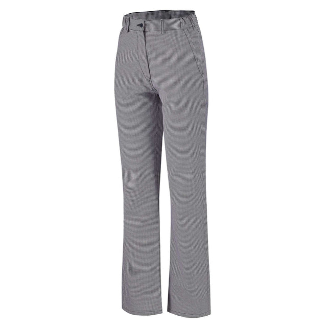 Ce pantalon pied-de-poule est un vêtement de cuisine 100 % coton. Il associe le confort de la fibre naturelle et la facilité d’entretien. Le pantalon de cuisine femme HELENA est confectionné dans un tissu croisé 250 grammes, lavable en machine jusqu’à une température de 95°C. Il est doté d’une braguette zippée, de 2 poches italiennes et d’une poche revolver fermée par bouton. Pour plus de confort et de souplesse, ce pantalon professionnel pour femme dispose d’une taille haute et d’une ceinture élastiquée sur les côtés, équipée de 5 passants. Pour compléter votre tenue de travail, ce pantalon traditionnel de cuisinier se mariera parfaitement avec une veste de cuisine blanche.