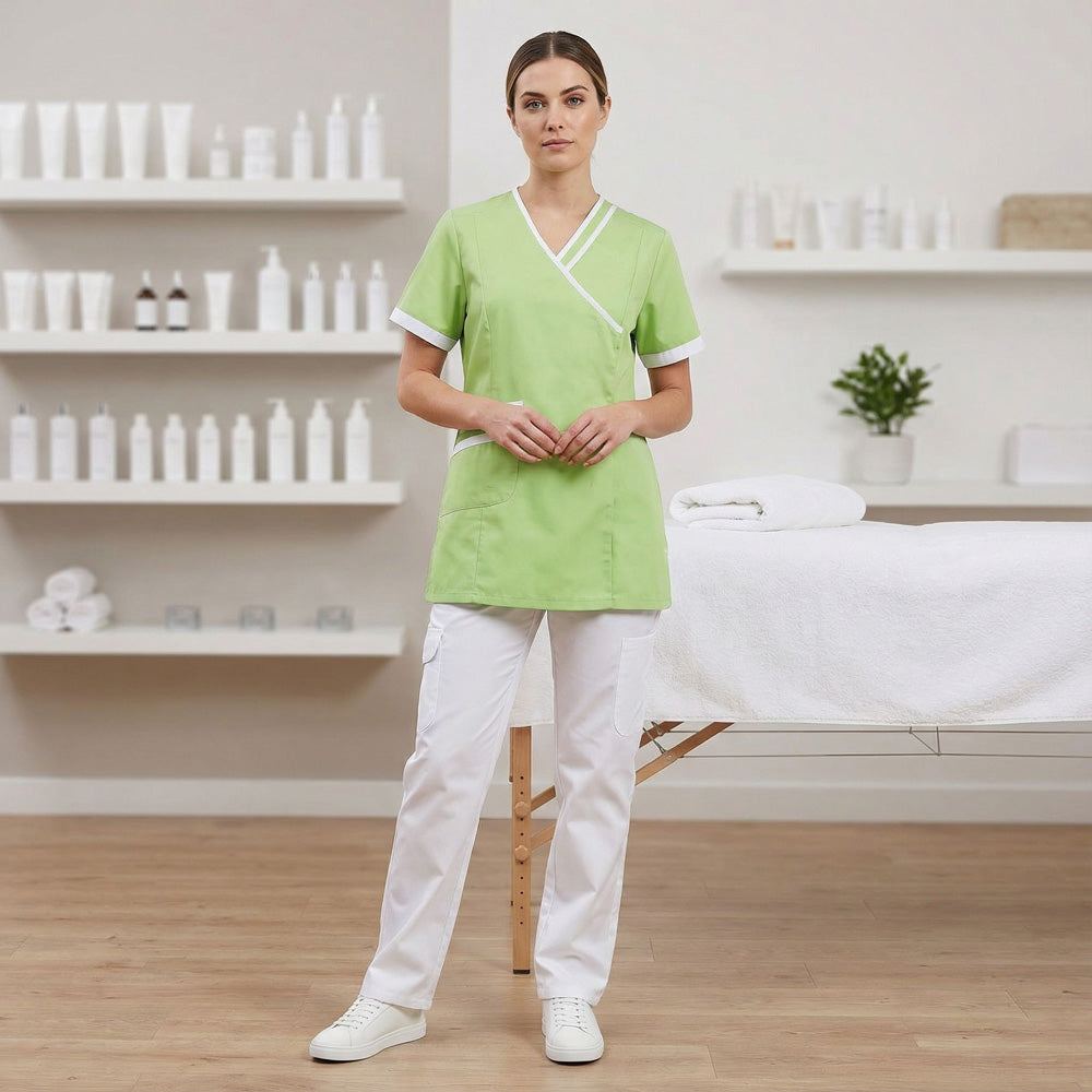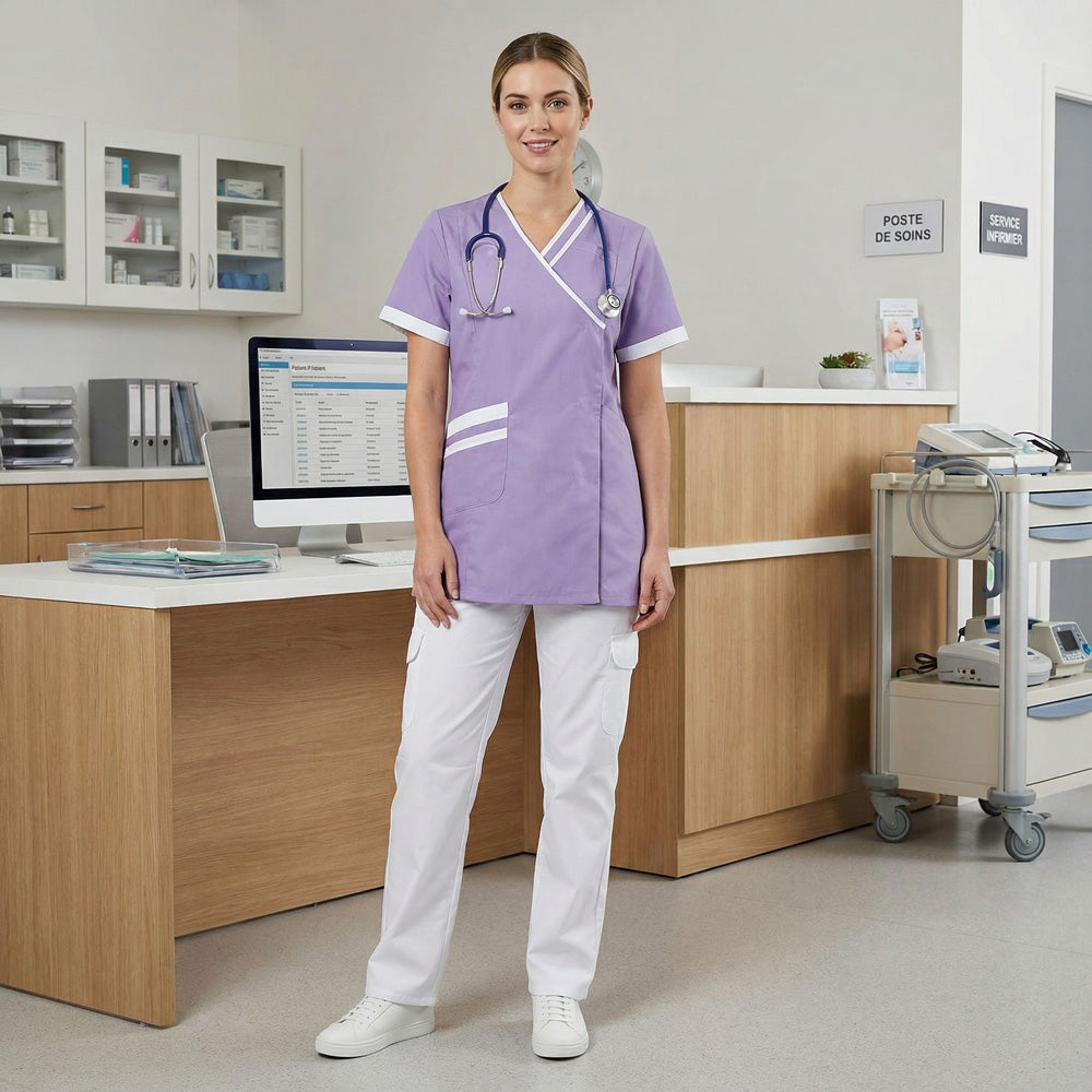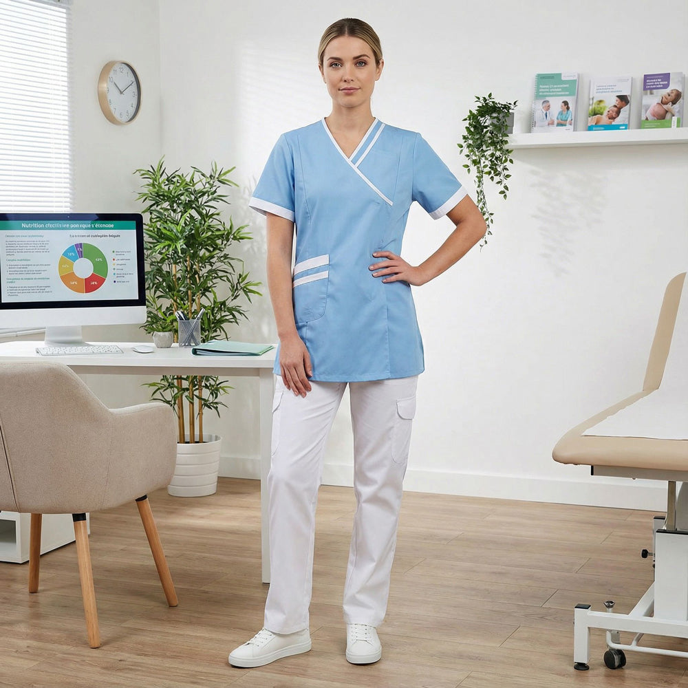 Une tunique professionnelle élégante pour les femmes travaillant dans l’esthétique, les soins ou encore en milieu pharmaceutique et paramédical. Pourvue d’une jolie pointe de couleur sur l’encolure et d’une fermeture façon « cache-cœur » à grippers, la tunique de travail femme Lilée adopte un style moderne. Agréable à porter, elle se compose d’un tissu Sergé 50% polyester 50% coton 180 gr doux et léger. Cette blouse manche courte dispose également d’une poche poitrine pour stylo ou porte-bip, 2 poches basses pour plus de fonctionnalité ainsi que des découpes princesses offrant un beau cintrage féminin. Le biais de col coloré se décline en fuchsia, orange ou vert pomme selon votre goût.
