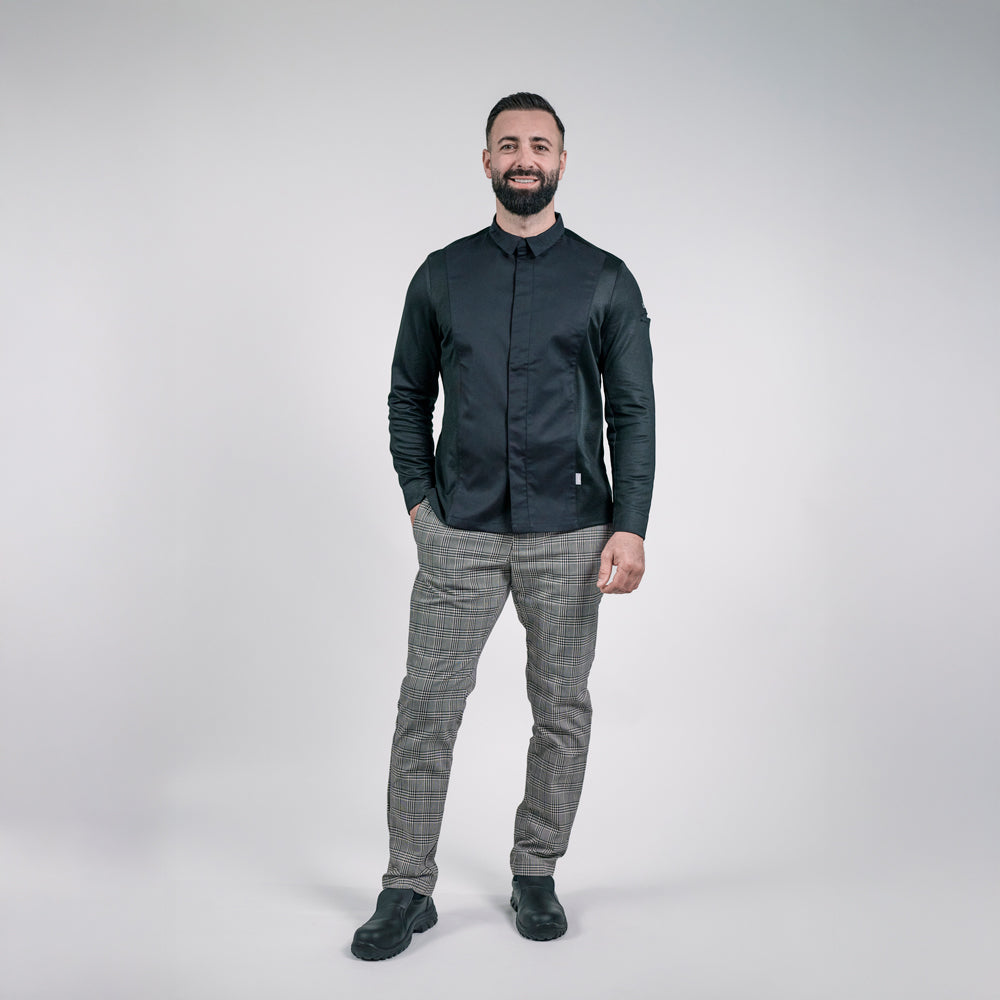 Veste de cuisine pour homme, évolution de CARDAMONE, un modèle bi-matière alliant tissu respirant en maille pour les manches et le dos. Avec son col chemise rabattu, son plastron devant et une ouverture centrale dissimulée par une patte cachée, elle incarne l'alliance parfaite entre élégance et fonctionnalité pour les professionnels de la cuisine en représentation.